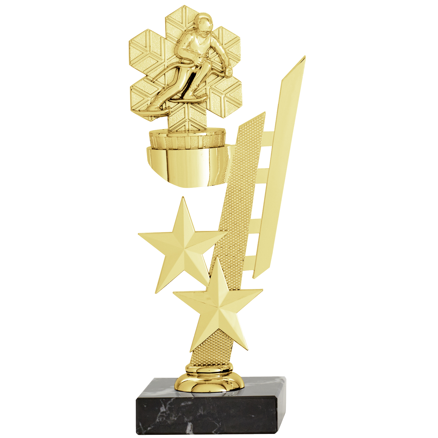 Moderner Aufsteller aus Kunststoff für Langlauf in drei Größen mit goldener winterlicher Figur. Der Fuß ist in Silber aufwendig mit verschiedenen Strukturen und Sternapplikationen, auf hochwertigem schwarzem Marmorsockel. Überraschen Sie mit dieser Trophäe Ihre Sieger mit etwas Außergewöhnlichem! Gravur bereits im Preis enthalten.