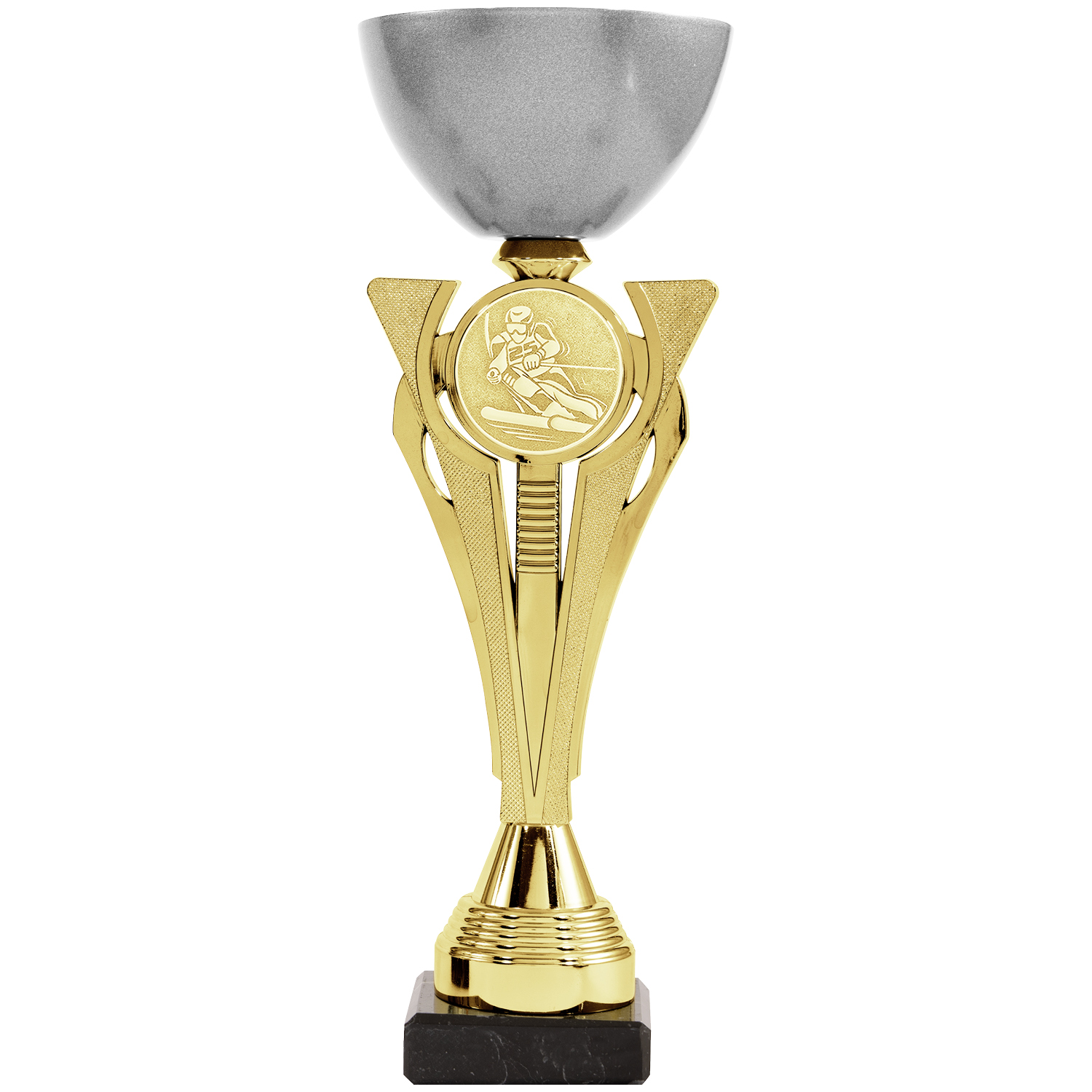 Moderner Siegerpokal in Gold (33cm), Silber (31cm) oder Bronze (28,5cm) Optik in 3 Größen mit klassischer grauer Schale und edlem Marmorsockel. Das dynamische Design des Mittelstücks mit zentralem Emblemhalter macht die Trophäe zur perfekten Auszeichnung für Ihren Wettbewerb und bietet sich perfekt für Platz 1-3 an.