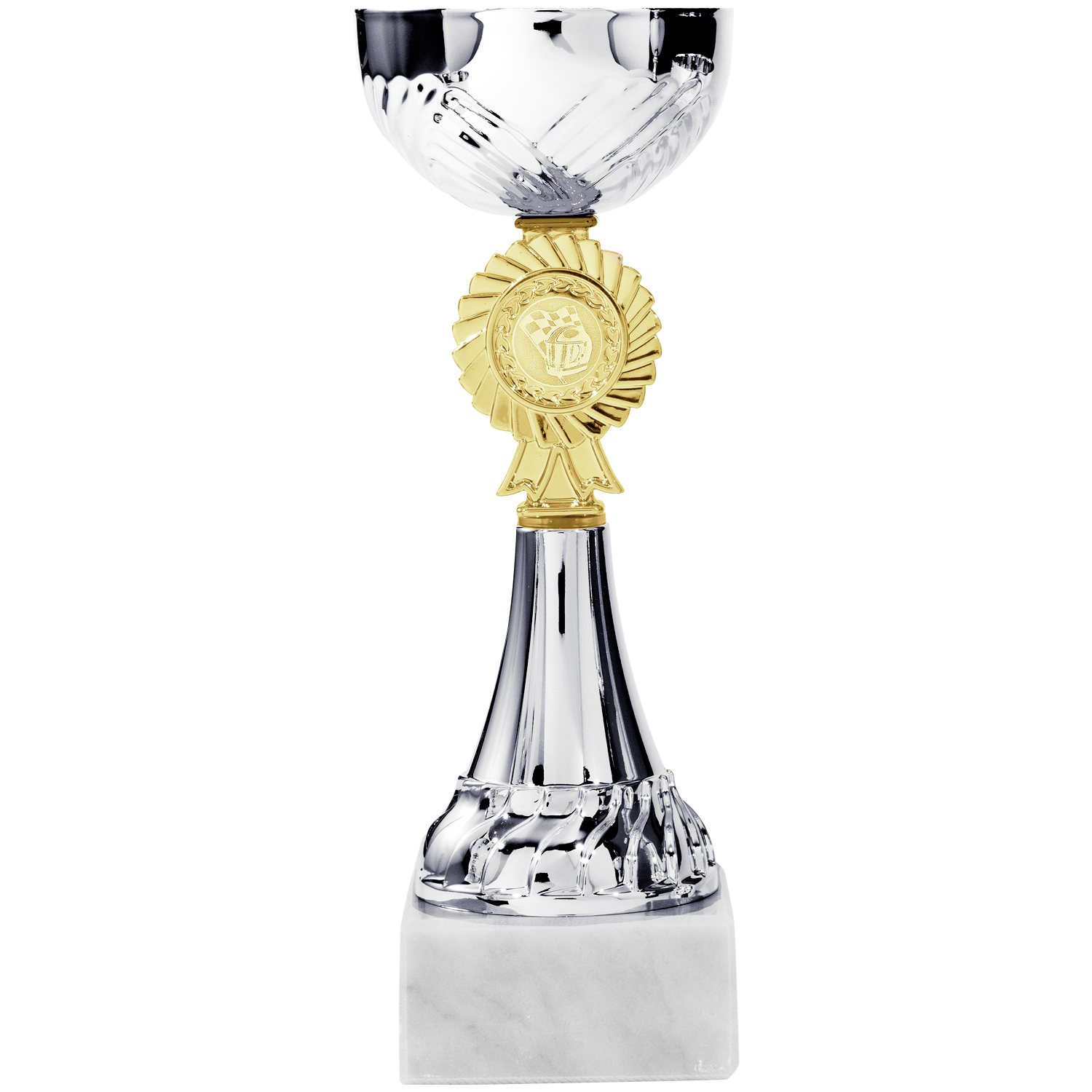 Moderne Pokalserie in Silber und Gold, in 5 Größen erhältlich, ab € 7,90. Mit weißem Marmorsockel. Die dezente, silberne Schale kombiniert mit einem goldenem Emblemhalter sorgt für die sportliche Erscheinung des Pokals. Emblem nach Wahl und Gravur auf Metallschild am Sockel im Preis enthalten.