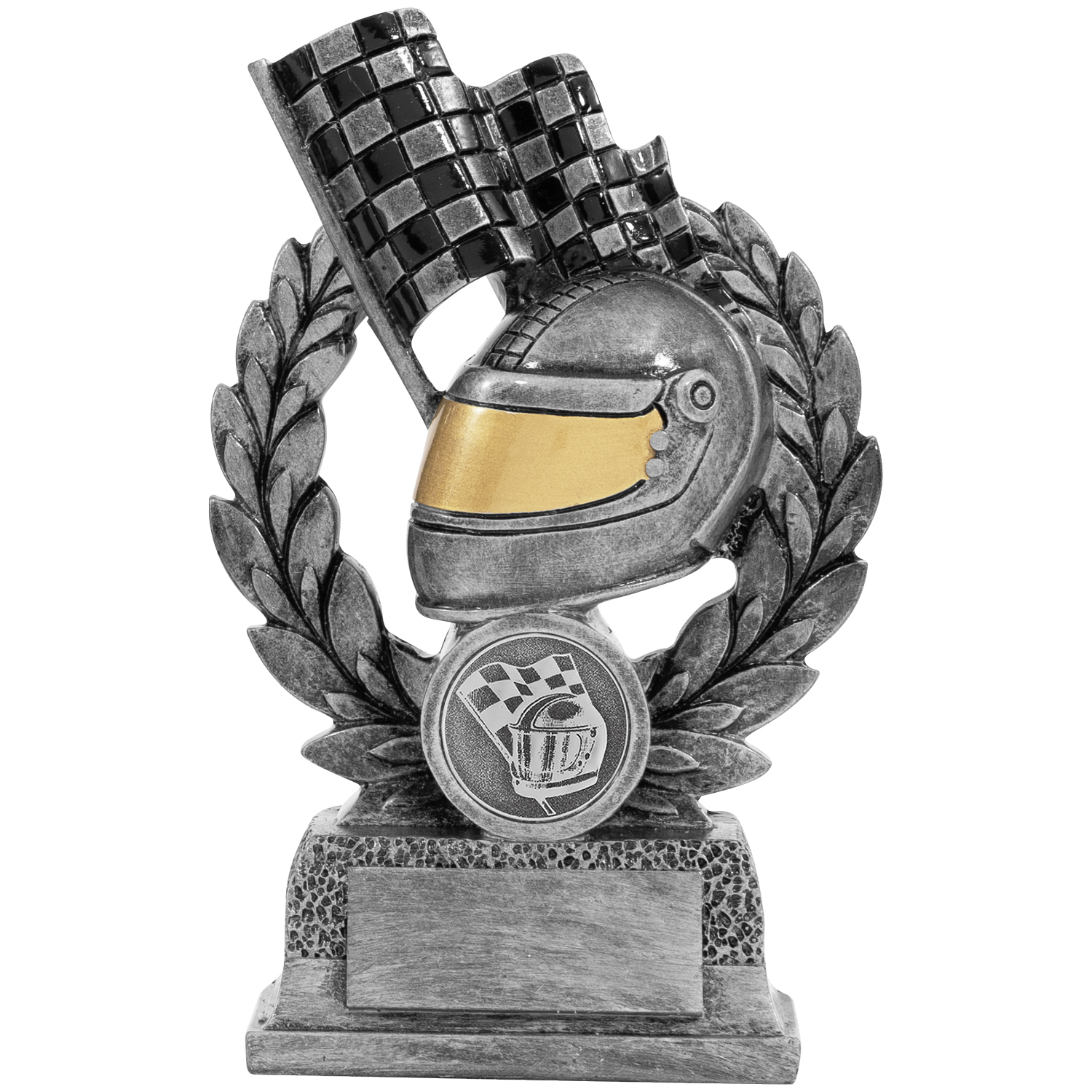 Ein toller Ehrenpreis für Ihre Motorsportveranstaltung. Motorsportaufsteller mit Helm und Flagge im Lorbeerkranz. In drei verschiedenen Größen erhältlich (11,2cm, 13,3cm, 15,2cm). Das Gravurschild auf dem schwarzen Sockel ist inbegriffen.