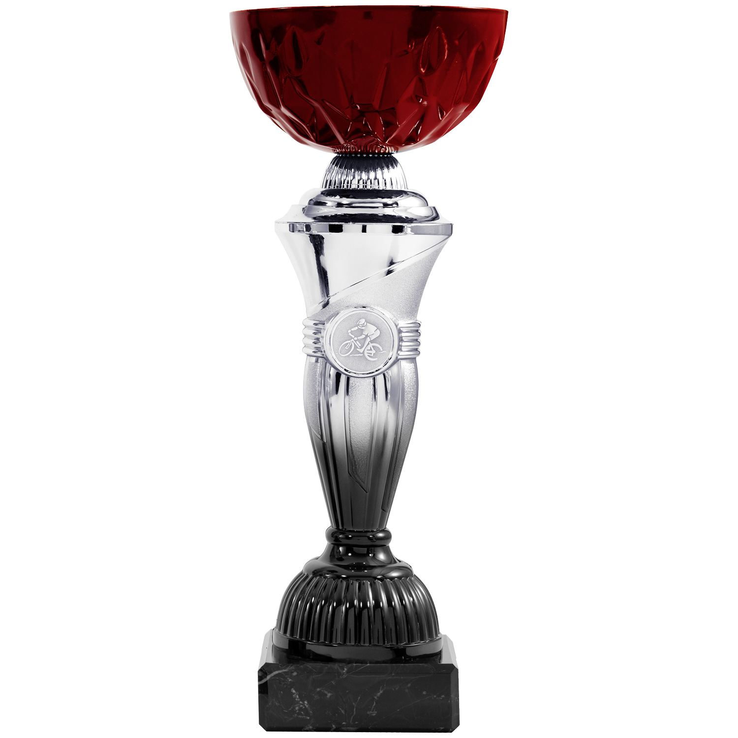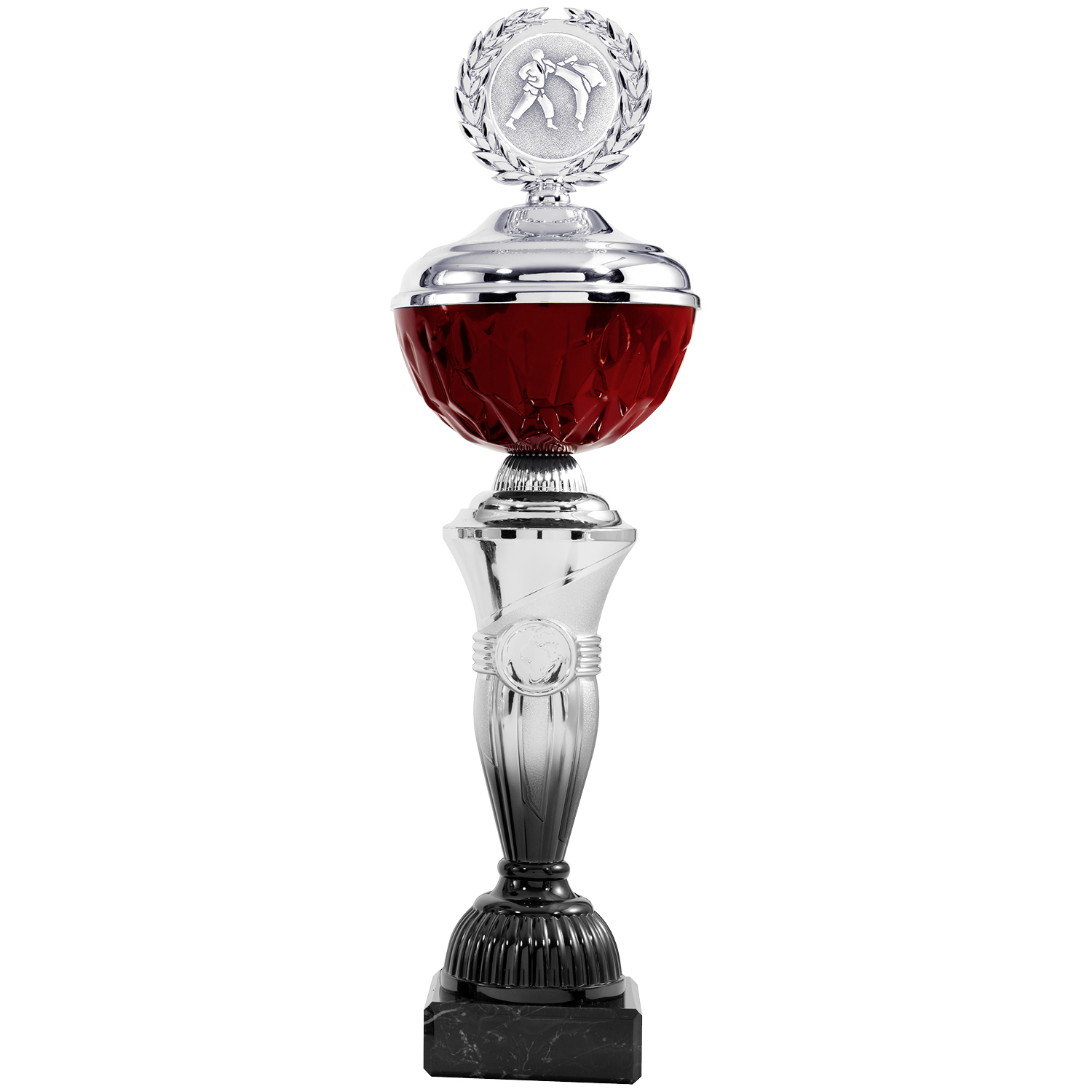 Neue ausdrucksstarke Pokalserie in 8 Größen (22cm – 31cm), optional mit Deckel (32cm – 42,5cm) in Silber-Schwarz mit bordeauxfarbiger Schale. Der Stil dieses Pokals wird bestimmt durch den Farbverlauf von Silber zu Schwarz im Mittelteil. Standardemblem oder individuelles Emblem möglich. Passend dazu der schwarze Marmorsockel.