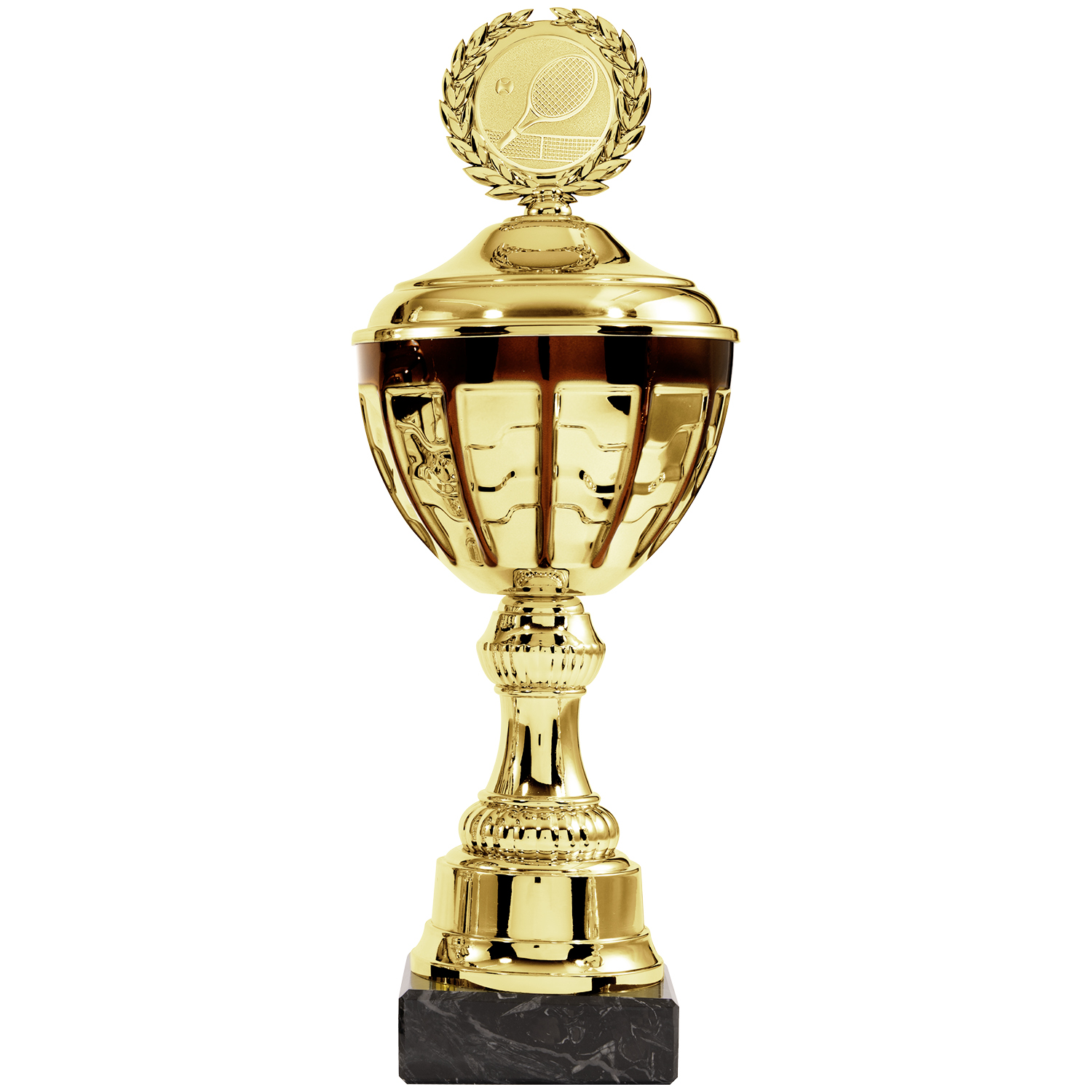 Prunkvoller Pokal in Gold in 10 Größen (26cm – 39cm). Besonders hervorzuheben ist die üppige goldene Schale mit bronzenen Akzenten, die durch einen goldfarbenen Fuß mit dem schwarzen Marmorsockel verbunden ist. Das Emblem findet hier im Deckel Platz.