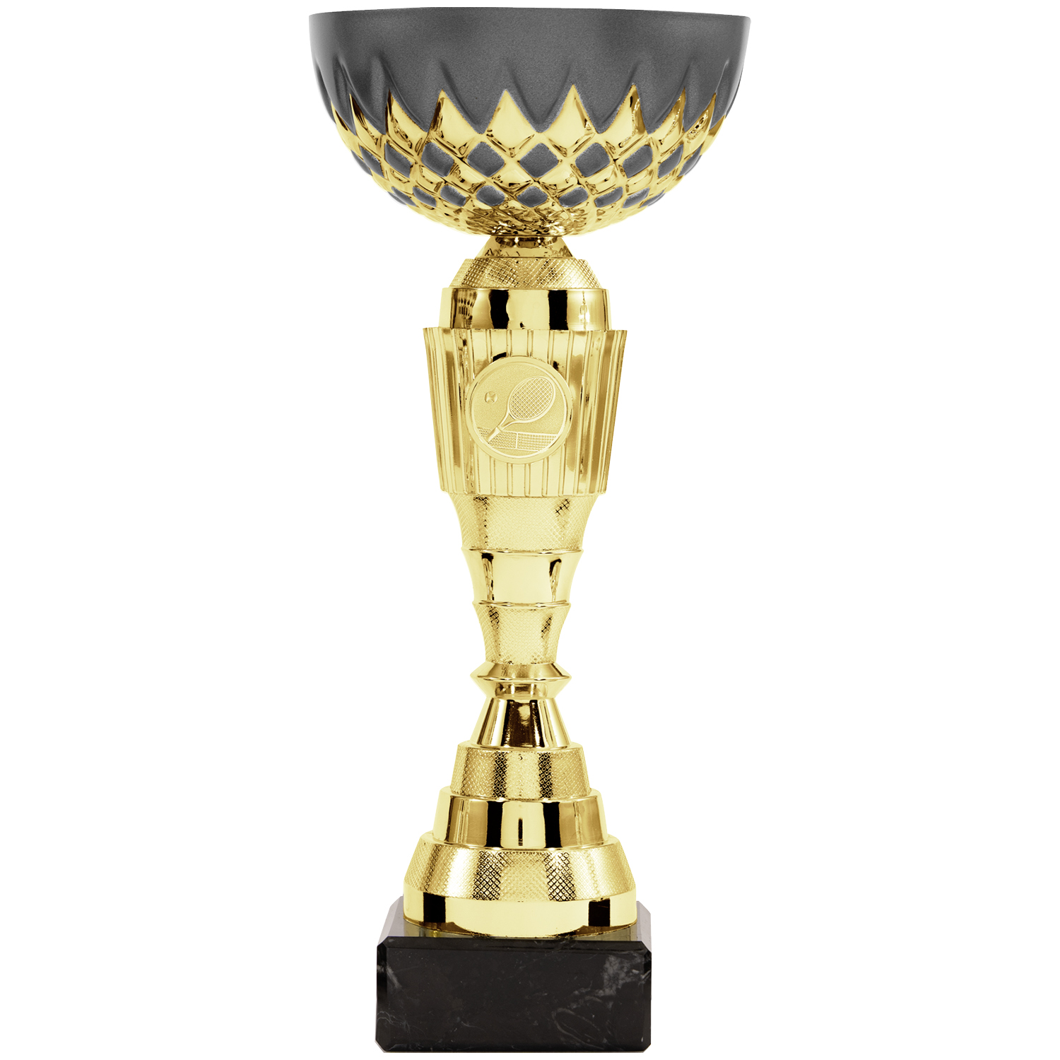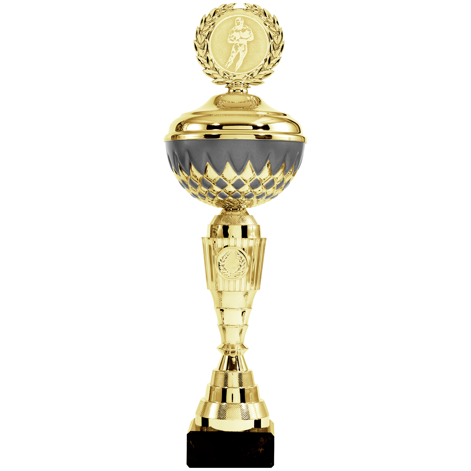 Neue ausgefallene Pokalserie in 8 Größen (21cm – 29cm), optional mit Deckel (31cm – 40,5cm) in glänzendem Gold. Die besondere Schale besticht durch mattschwarze Elemente. Das goldene Mittelteil bietet mit dem Emblemhalter Platz für ein Standardemblem oder ein eigenes Emblem. Der Sockel ist aus schwarzem Marmor, ideal für ein Gravurschild.