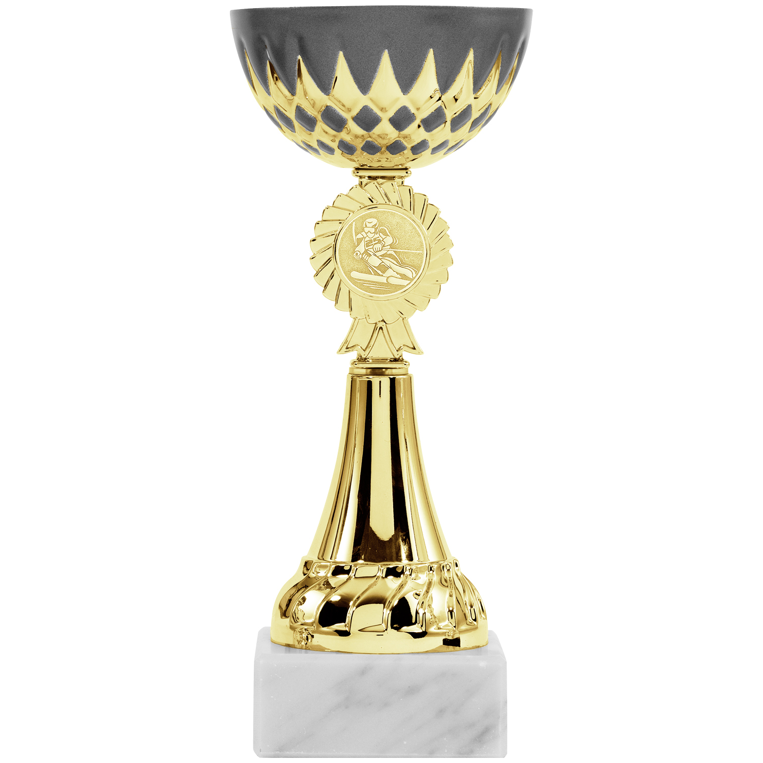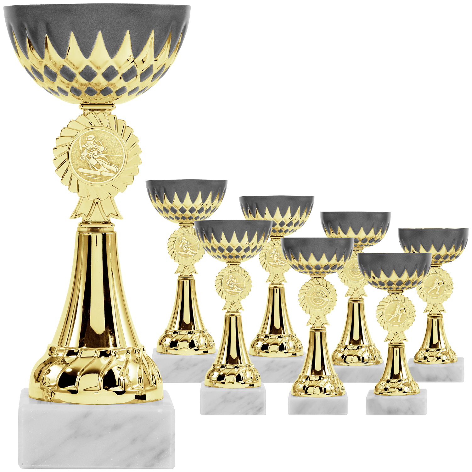 Neue prächtige Pokalserie in Gold und einer Schale in mattem Anthrazit mit goldenem Ziermuster am unteren Rand. In 8 Größen verfügbar (16cm – 22cm). In der Mitte des Pokals findet sich ein runder Emblemhalter mit einem Lorbeerkranz. Gerne können Sie hier ein Emblem aus unserer Auswahl oder auch ein eigenes Emblem platzieren (kostenlos ab 20 Pokalen, darunter 15 Euro Layoutkosten).
