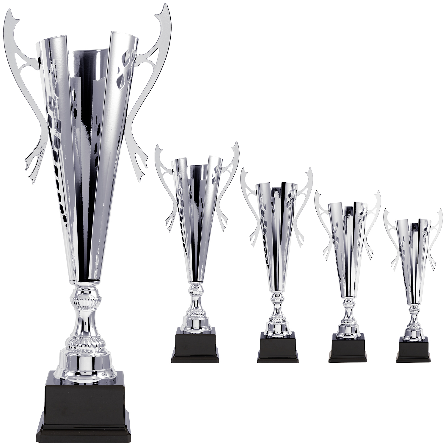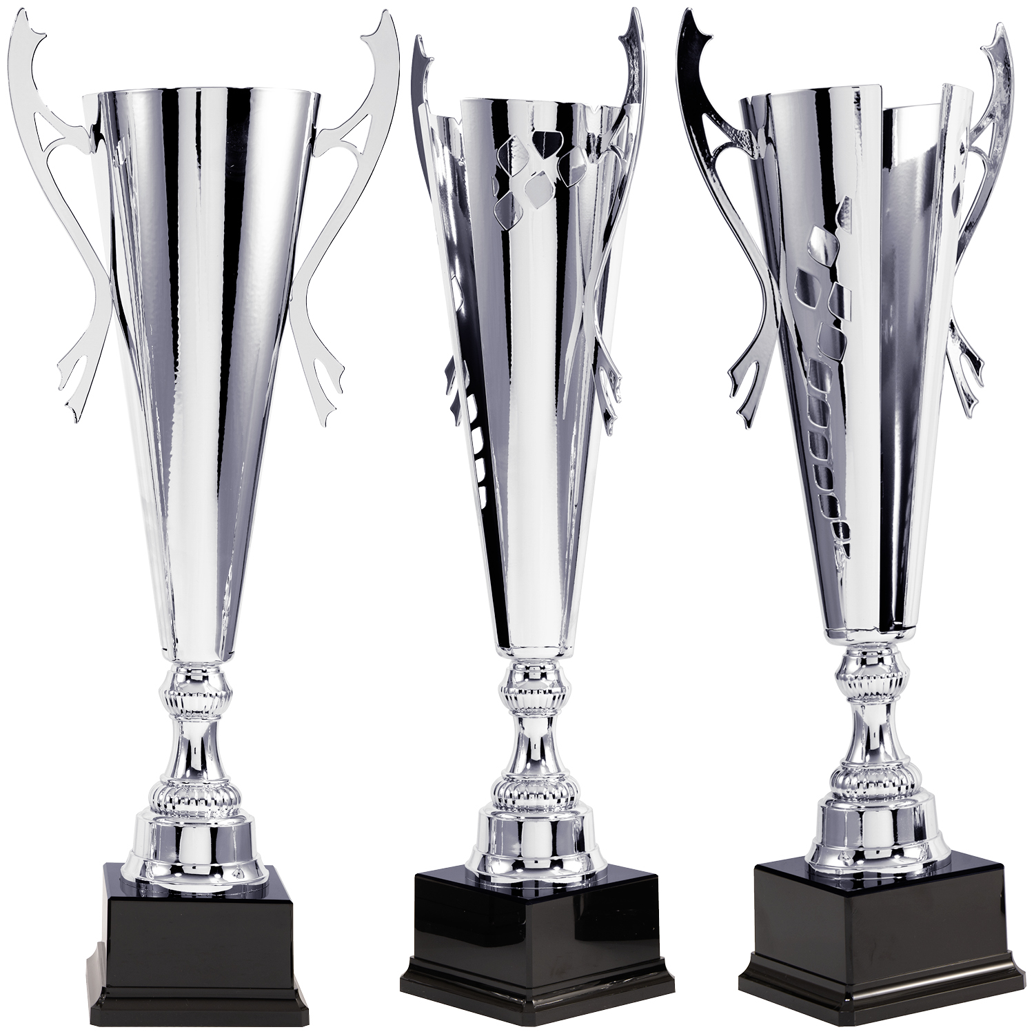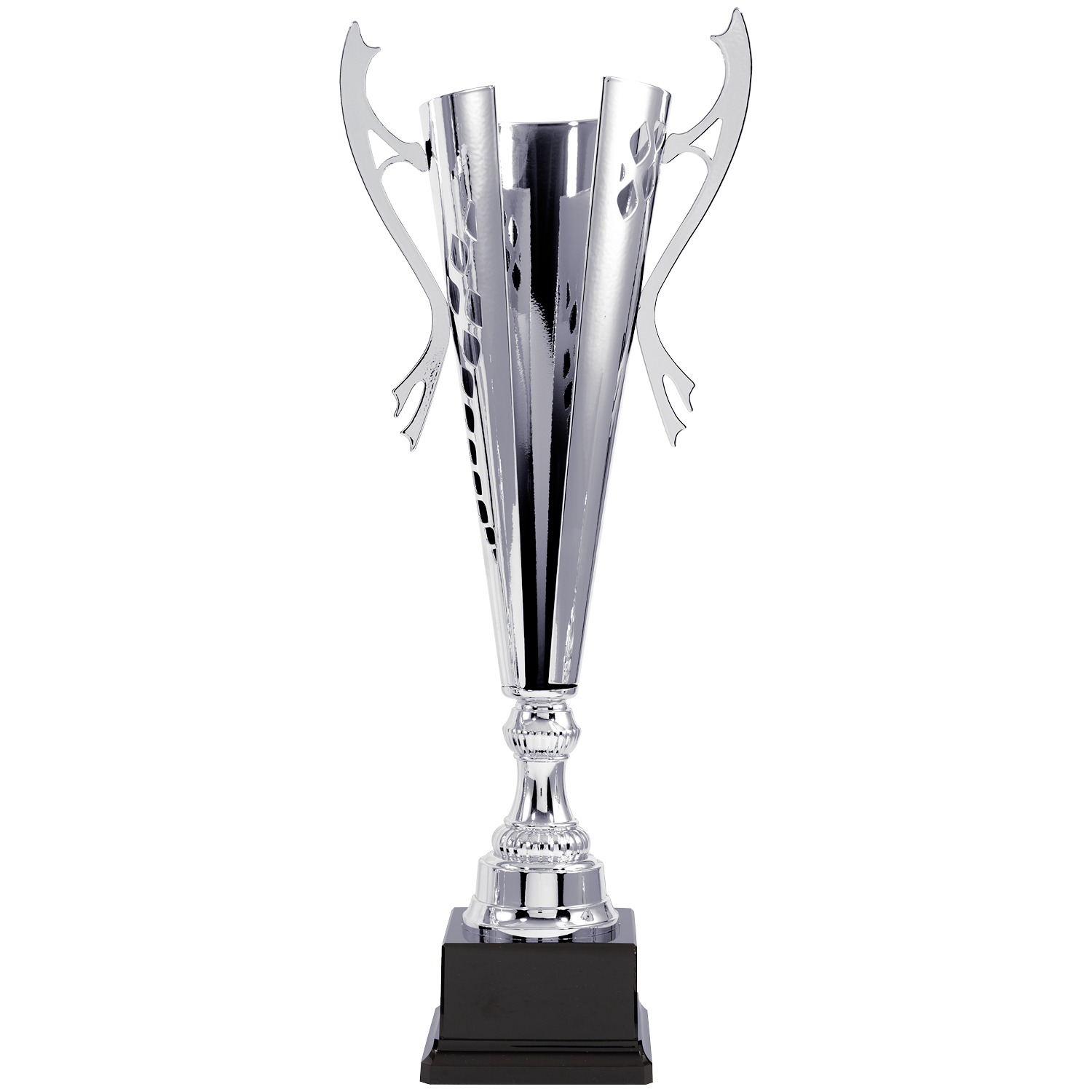 Eleganter, silberfarbener Pokal mit modernem Design und geschwungenen Henkel in 5 Größen (50cm - 63,5cm). Hochwertige Verarbeitung und moderne Aussparungen in der schlanken Schale des Pokals machen diesen zu einem echten Blickfang auf jeder Siegerehrung.
