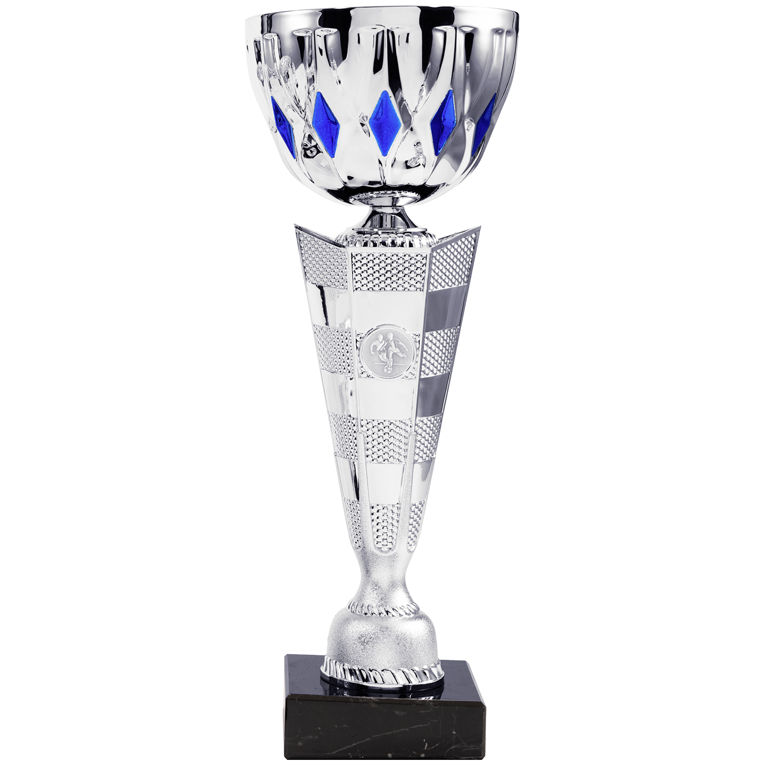 Der silberfarbene Pokal ist hoch und elegant und in 8 Größen (26,5cm -39cm), optional mit Deckel (36cm – 51cm) erhältlich. Oben hat er eine breite, glänzende Schale mit blauen Farbakzenten, darunter ein mächtiges, gemustertes Mittelteil mit einem Emblemhalter. Er steht auf einem schwarzen Sockel und wirkt hochwertig sowie würdevoll – ein klassischer Siegerpokal. Nur online erhältlich.
