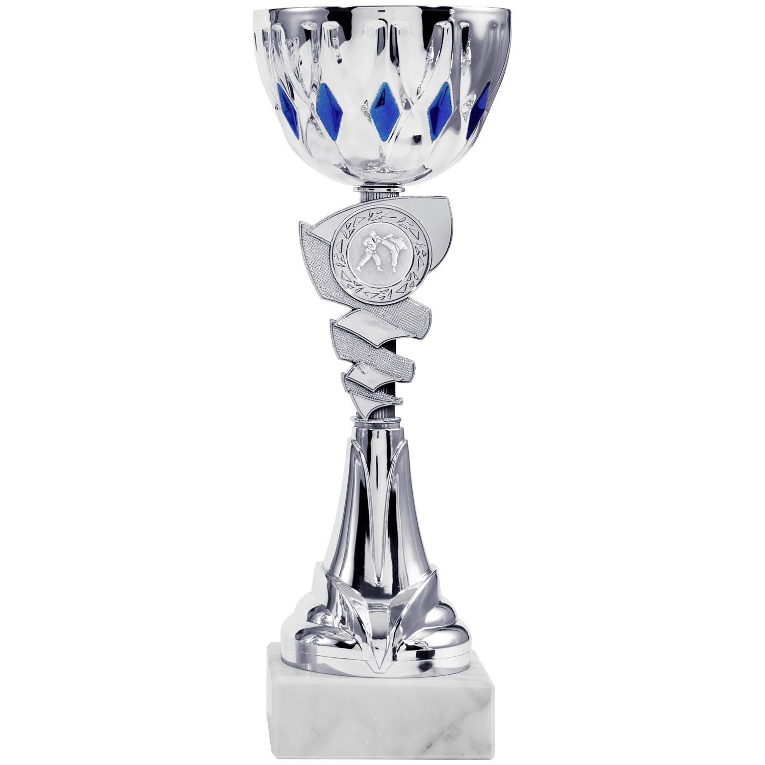 Der silberfarbene Pokal ist hoch und elegant und in 10 Größen (21cm -30,5cm) erhältlich. Oben hat er eine breite, glänzende Schale mit blauen Farbakzenten, darunter ein mächtiges, gemustertes Mittelteil mit einem Emblemhalter. Er steht auf einem weißen Sockel und wirkt hochwertig sowie würdevoll – ein klassischer Siegerpokal. Nur online erhältlich.