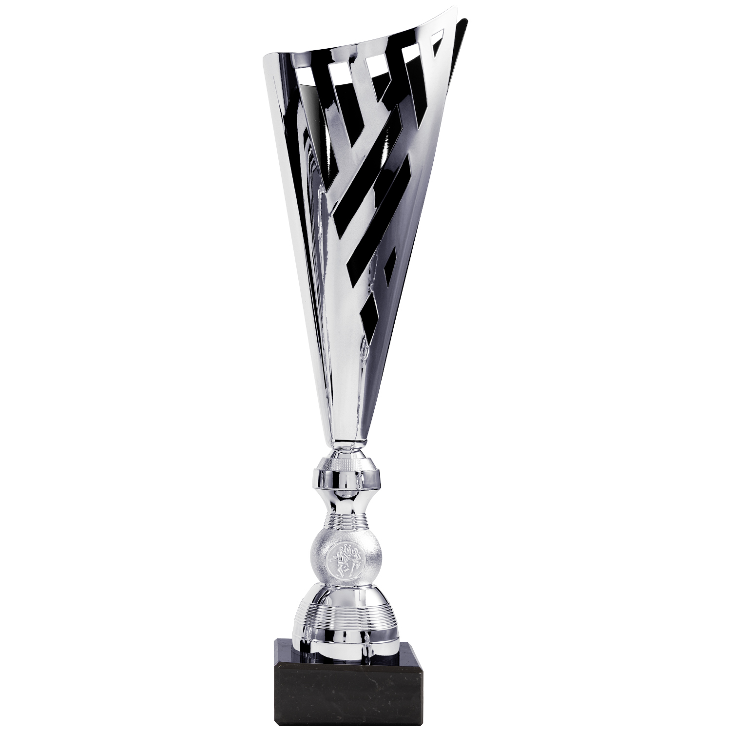 Moderner, eleganter Pokal in Silber mit schwarzem Innenleben in 8 Größen (34,5cm – 46,5cm). Die geschwungene Form sowie die modernen, geometrischen Aussparungen sind der Blickfang dieses Pokals. Trotz seines modernen Designs lässt die klassische, ruhige Farbkombination den Pokal elegant wirken. Ein Emblem nach Wahl und die Gravur auf einem Metallschild am Sockel ist im Preis enthalten.