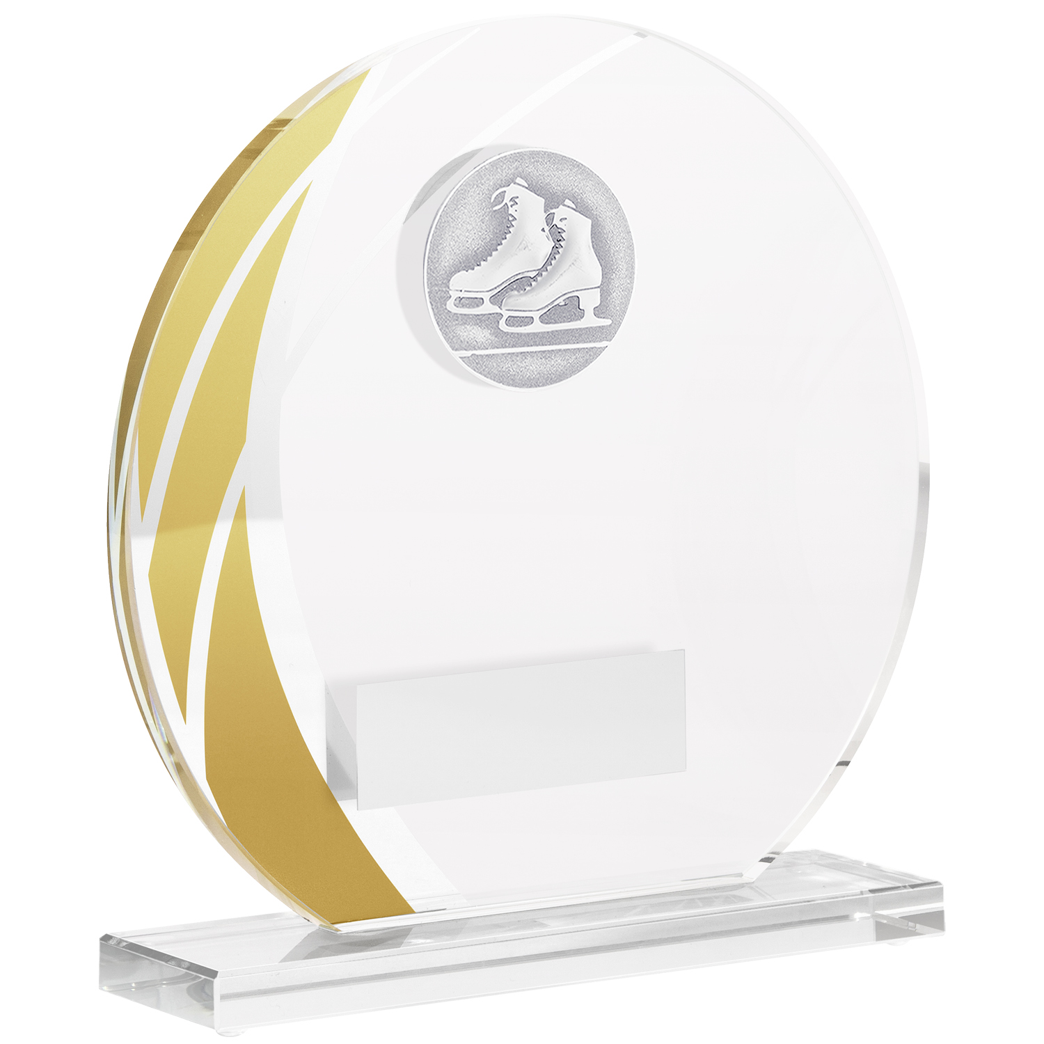Schöne hochwertige und edle Glasvariante in drei Farben, abgestuft in drei Größen ab € 33,90. Runde Grundform mit seitlichen Akzenten in Gold, Silber und Bronze und als besonderes Highlight seitlich geschwungene silberne Streifen im Hintergrund. Schwere und stabile Ausführung durch eine Glasstärke von 1 cm auf stabilem Glassockel. Gravur auf separatem Metallschild im unteren Drittel der Trophäe und Emblem oben. Emblem nach Wahl und Gravur auf Metallschild im Preis enthalten.