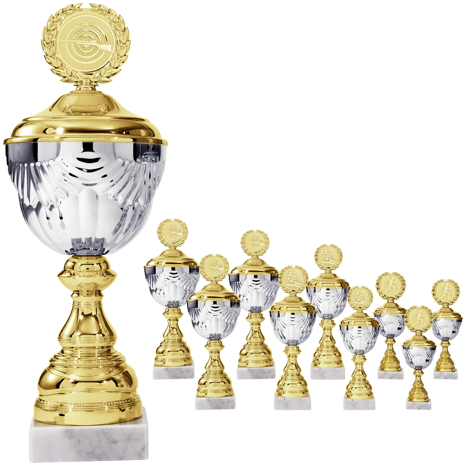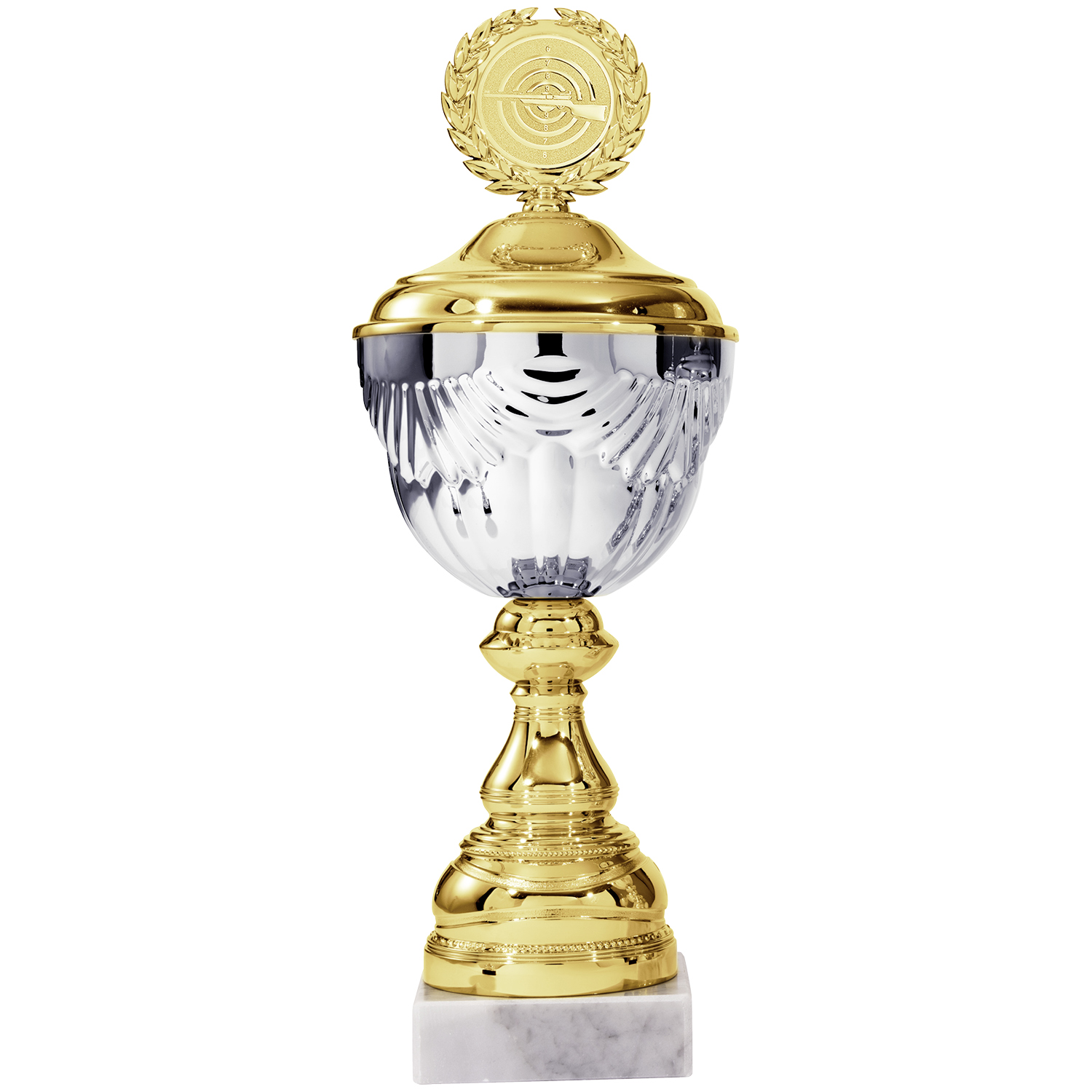 Schöne silber - goldene Pokalserie incl. Deckel mit edler Schalenprägung . Verfügbar in zehn Größen bis zu 40,5 cm. Der Pokal besticht durch die Zweifarbigkeit und Größe auf Marmorsockel. Emblem nach Wahl und Gravur auf Metallschild am Sockel bereits im Preis enthalten.