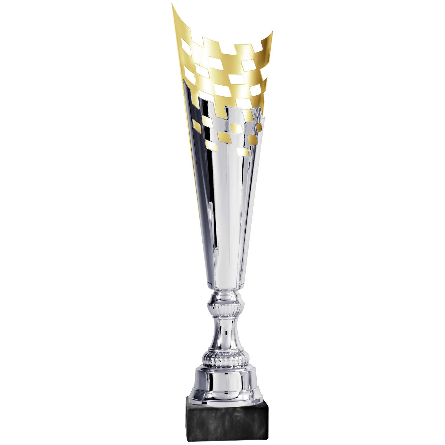 Dieser moderne Pokal in silberner Ausführung mit Zielflaggenoptik und goldener Innenfarbe verkörpert ein dynamisches und elegantes Design. Die äußere Oberfläche des Pokals ist in einem glänzenden Silber gehalten, das dem Gesamtbild einen Hauch von Raffinesse verleiht, die Zielflaggen werden kunstvoll in das Silber eingearbeitet, um einen klaren Kontrast und visuellen Reiz zu schaffen. Dieses Design vermittelt ein Gefühl von Dynamik und Energie. In sechs Größen erhältlich. Mit schwarzem Marmorsockel. Gravur auf Metallschild am Sockel im Preis enthalten. Kein Emblem möglich.
