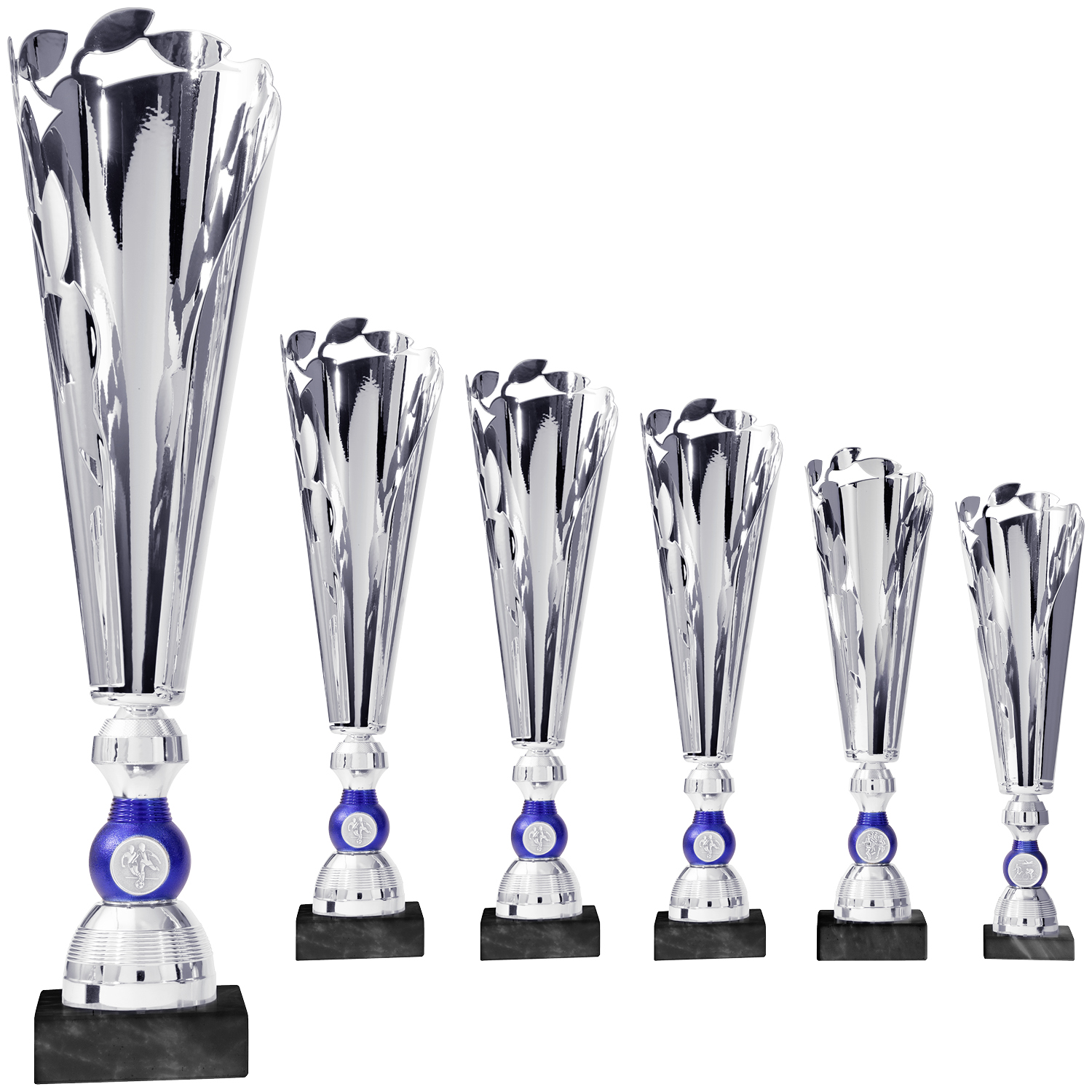 Futuristische Trophäe in sechs Größen erhältlich. Außergewöhnliches silbernes großes Metallelement in geschwungener Form mit gelasertem auf silber-blau designten Fuß mit Emblemhalter, auf schwarzem Marmorsockel. Emblem nach Wahl und Gravur auf Metallschild am Sockel bereits im Preis enthalten.