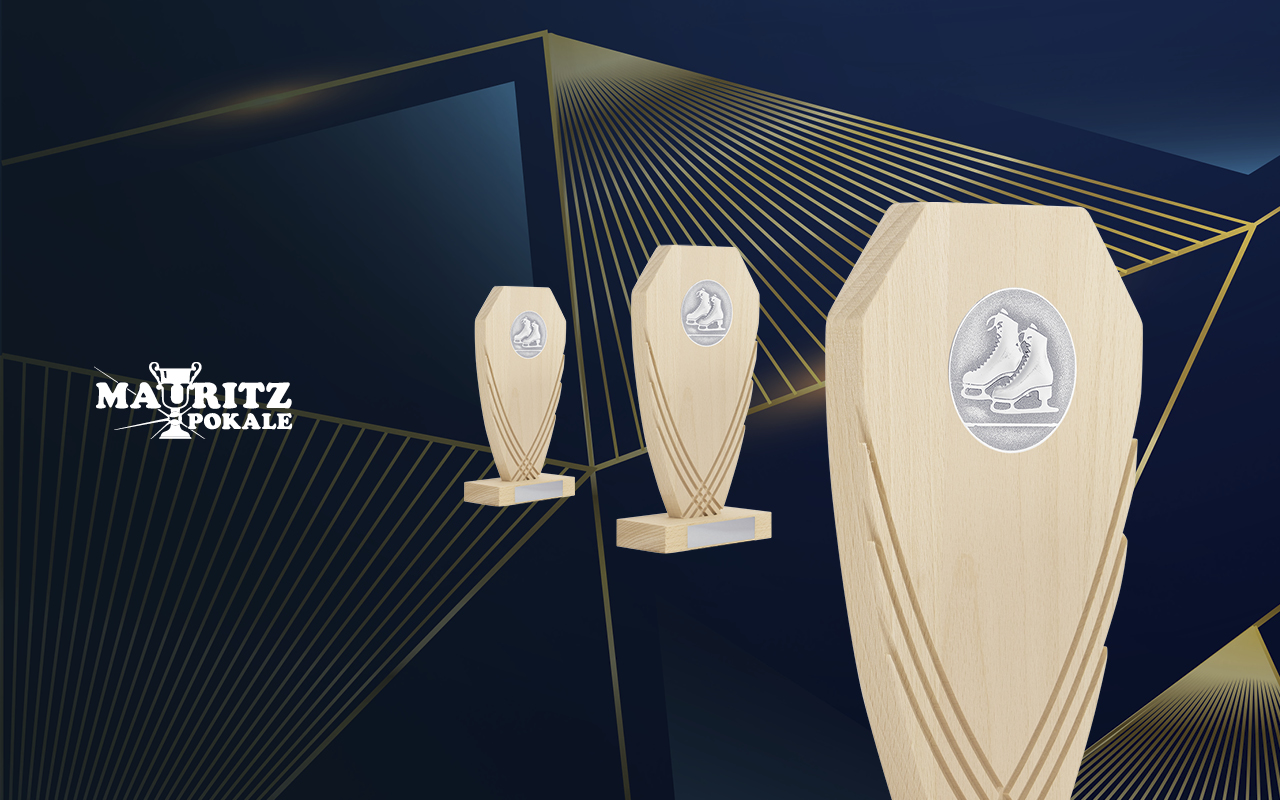 Hochmoderne edle Neuheit aus Holz. In drei Größen erhältlich, ab € 29,90. Ausführung mit zweifarbigem Holz in dunkelbraun und natur, mit rundem dunkelbraun Emblemhalter aus Holz und Gravurschild auf Holzsockel. Emblem nach Wahl und Gravur auf Metallschild am Sockel im Preis enthalten. Ohne Angabe wird Emblem und Gravurschild in silber geliefert, ist aber auch mit goldenen Elementen möglich.